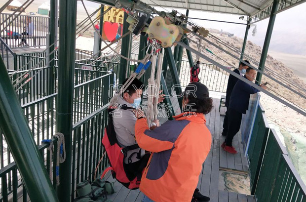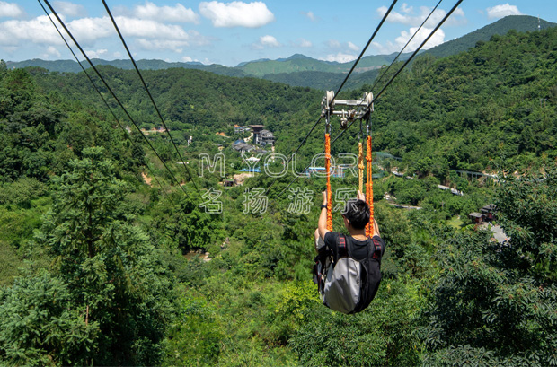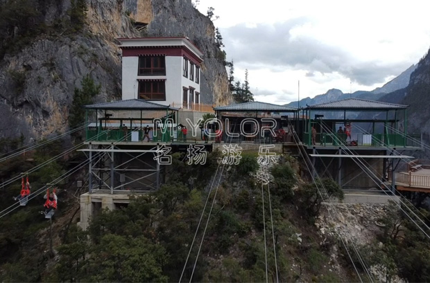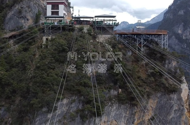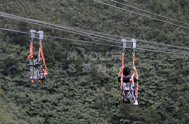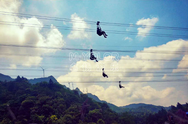 滑索屬于極限運動的一種。該項目投資少、見效快、經濟效益可觀,素有“空中印鈔機”之稱。滑索運動充滿速度感和刺激感,穿戴好安全吊具的乘客,懸掛在滑動小車下,以斜拉的兩根鋼絲繩為軌道,借助高差、利用重力,從高處的發射臺順勢而下,以較高的速度完成滑翔。可輕松地跨越草地、湖泊、河流、峽谷等地方,使人在有驚無險的歡愉中盡情的陶醉于大自然的迷人美景之中,給予了人們親近大自然、忘我地融入大自然的驚險刺激和超常體驗,既扣人心弦又安全可靠。