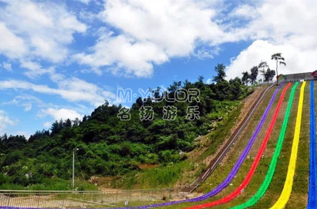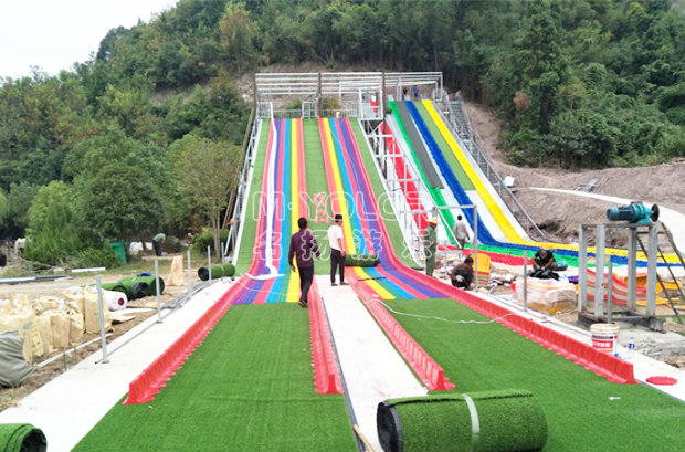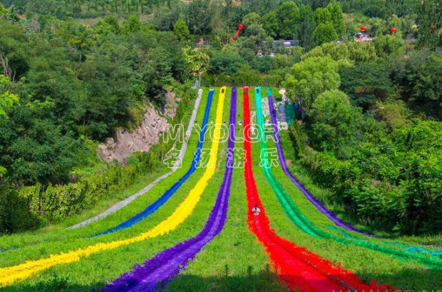 根據地形地質情況依山而建,依靠人造草皮鋪設而成,草場長度一般在100-120m間,其中100m為沖坡、二十米為緩沖坡;坡度一般在30-50度,滑道間距1.5米,可根據場地需求定制不同色彩的滑道.